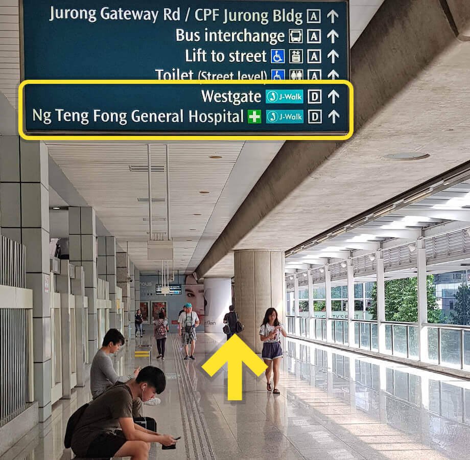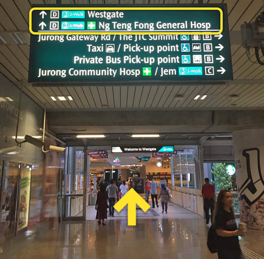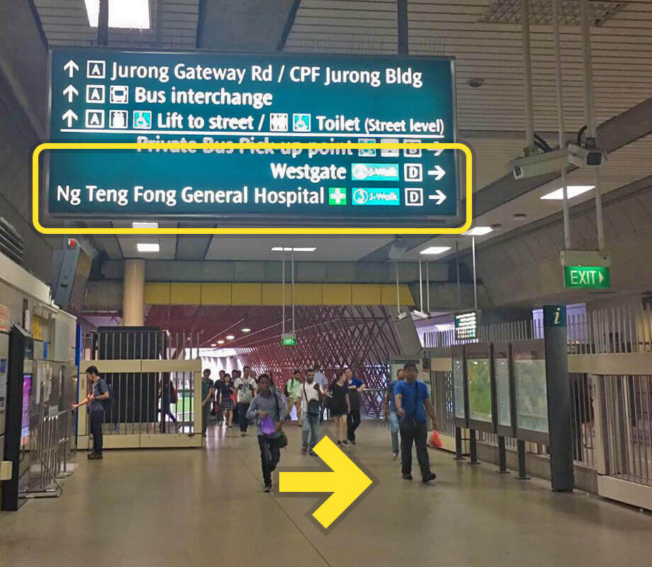 Upon exit from the MRT gantry, use Exit D towards Westgate/Ng Teng Fong Hospital.