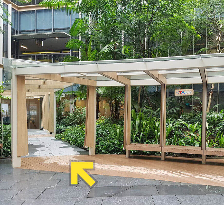 Upon exit from the lift at level 3, walk towards the covered walkway (Tripartite Way) and follow the path to the left.
