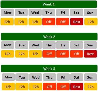 This is one of the most common schedules for employees or workmen not covered under Part IV of the Employment Act . Under a 4-day work week schedule, employees work four 10-hour days and take the fifth day off (See example A below).
