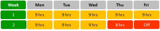 If your employees or workmen are covered under Part IV of the Employment Act, you may consider a four and a half day workweek, where employees work four 9-hour days and one 4-hour day (See example C below).