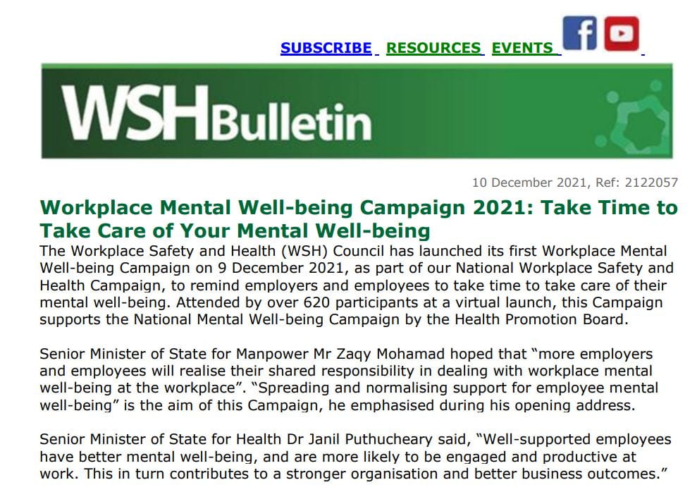 Poor mental health at the workplace has been a growing concern. The COVID-19 pandemic has given rise to new working conditions, resulting in an increase in workplace stress and anxiety. Organised by the Workplace Safety and Health (WSH) Council, the Workplace Mental Well-being Campaign addresses the importance of mental well-being in the workplace, an essential component of the overall health which can impact the workers’ performance and even, their safety.