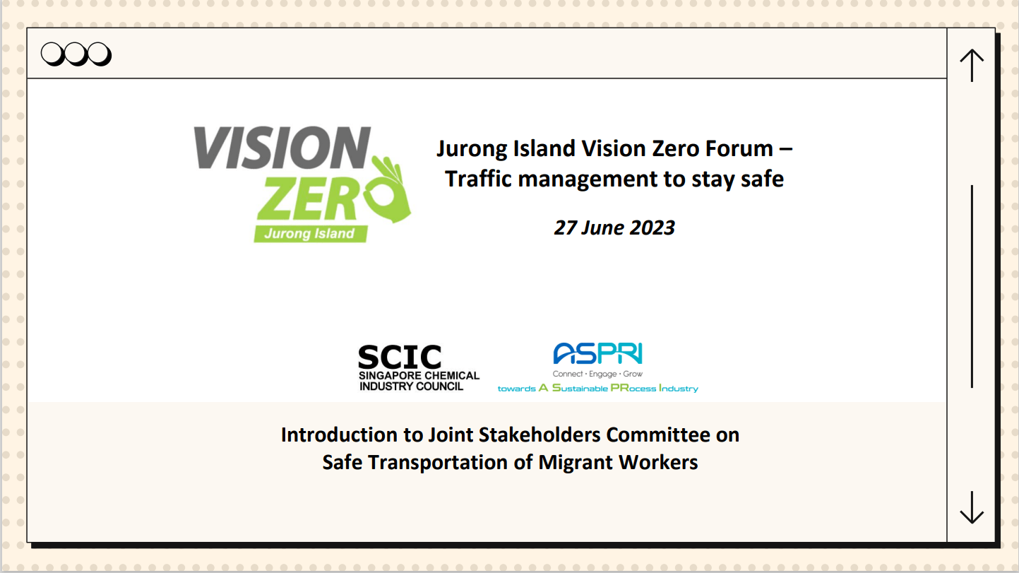 During an online forum on 27 June 2023, co-organised by the Singapore Chemical Industry Council (SCIC), Association of Process Industry (ASPRI), and Workplace Safety and Health Council, participants learnt different aspects of safety concerning the implementation of traffic management. A speaker from the Ministry of Manpower shared insights on past traffic incidents, lessons learnt, good practices as well as resources available to help companies implement good workplace traffic management.