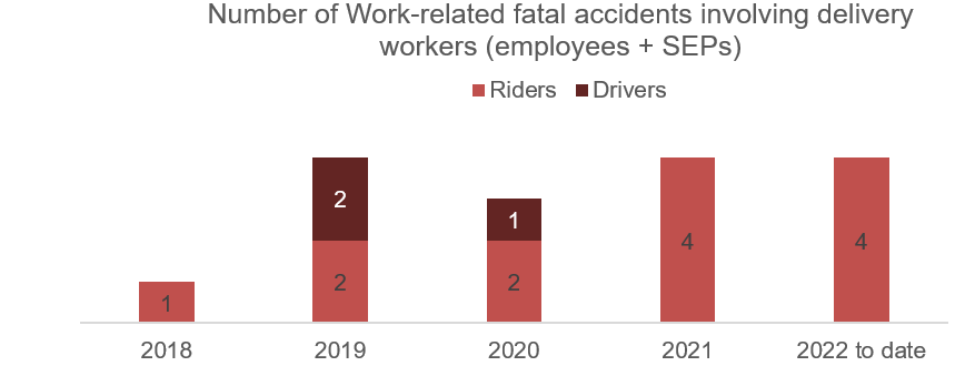 While the Workgroup acknowledged that accidents might be linked to the inherent risks in 2-wheeled vehicle commuting (13 of the most recent 16 cases involved 2-wheeled vehicles) as well as, in general, the risk of being on the road where accidents could arise from the behaviour of other road users, the Workgroup felt that delivery companies and intermediaries should do as much as possible within their control to prevent accidents.