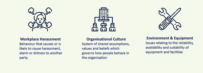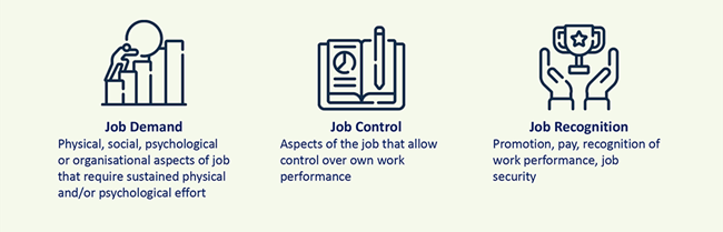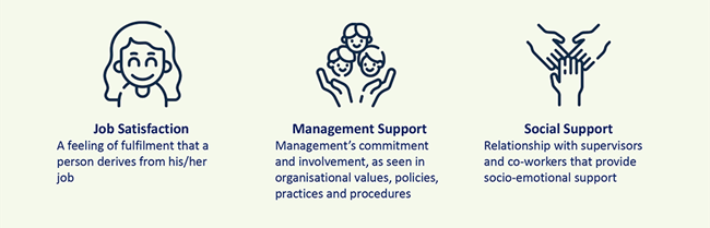 · Individual Resilience (covers individual mental well-being) · Organisational Resilience i.e. Workplace Stressors (covers risk factors such as job demands, job recognition and organisation culture) · Well-being at Work (covers work-related stress, burnout and depression) |