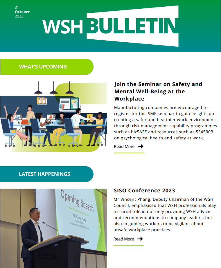 Developed by the Ministry of Manpower’s Workplace Safety and Health (WSH) Institute, in partnership with Changi General Hospital, Health Promotion Board, Institute of Mental Health and WSH Council, the iWorkHealth is a free online, company administered psychosocial health assessment tool that helps employers to understand their workforce’s state of well-being at work, covering work-related stress and burnout, and the key workplace stressors that employees are facing.