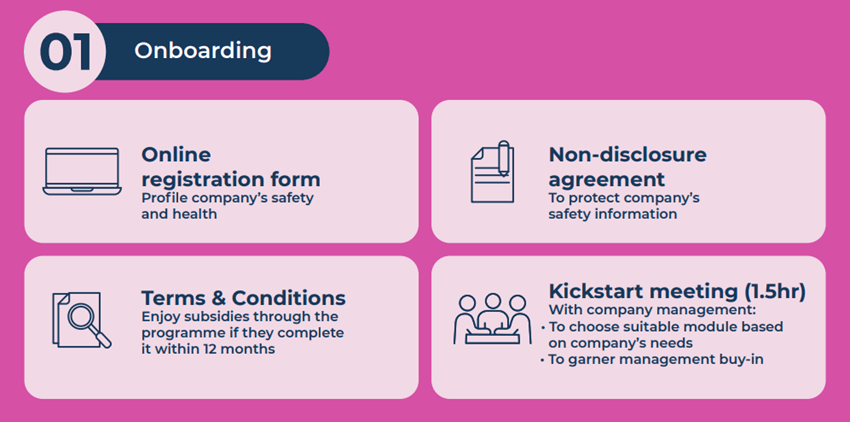 Your Total WSH service provider will guide you through the programme's onboarding, implementation, integration and sustainability, and offboarding phases: