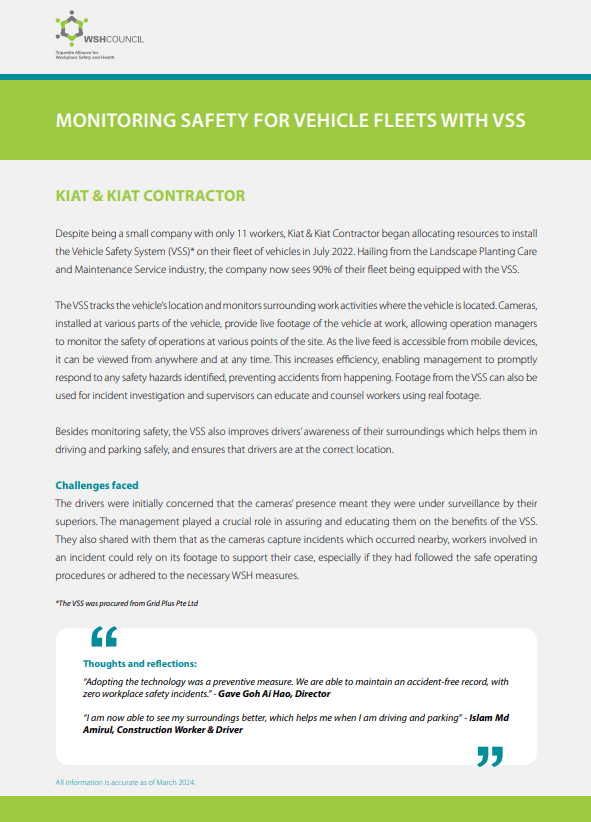 Despite being a small company with only 11 workers, Kiat & Kiat Contractor began allocating resources to install the Vehicle Safety System (VSS) on their fleet of vehicles in July 2022. Hailing from the Landscape Planting Care and Maintenance Service industry, the company now sees 90% of their fleet being equipped with the VSS.