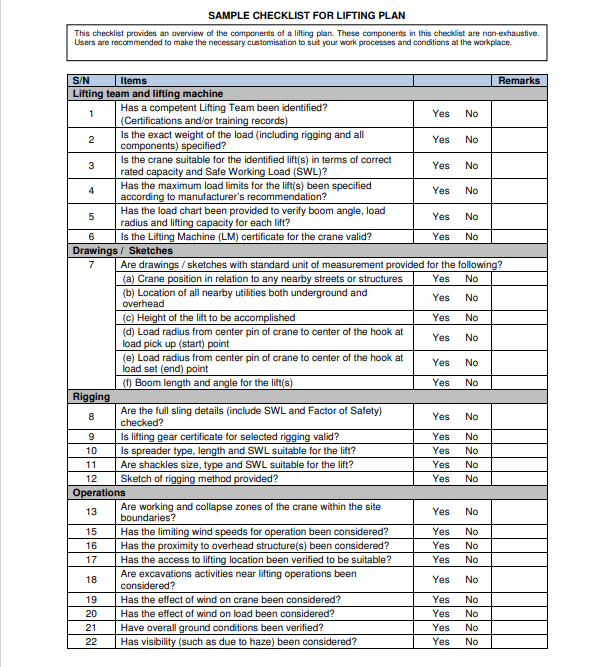 Safety Time Out sample checklist for Lifting Plan