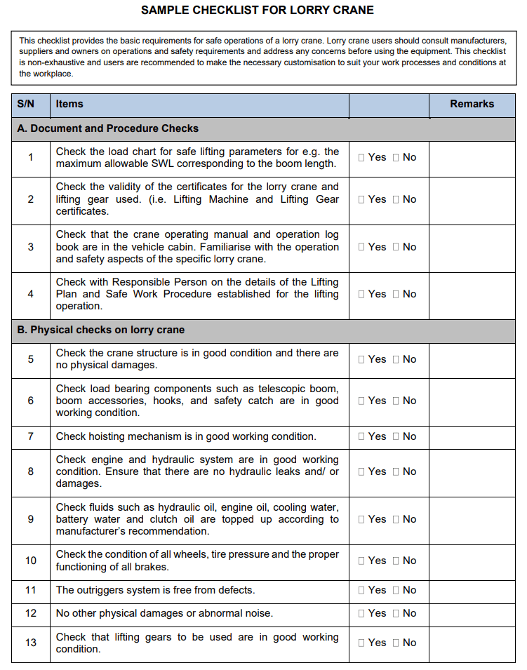 This checklist provides the basic requirements for safe operations of a lorry crane. Lorry crane users should consult manufacturers, suppliers and owners on operations and safety requirements and address any concerns before using the equipment. This checklist is non-exhaustive and users are recommended to make the necessary customisation to suit your work processes and conditions at the workplace.