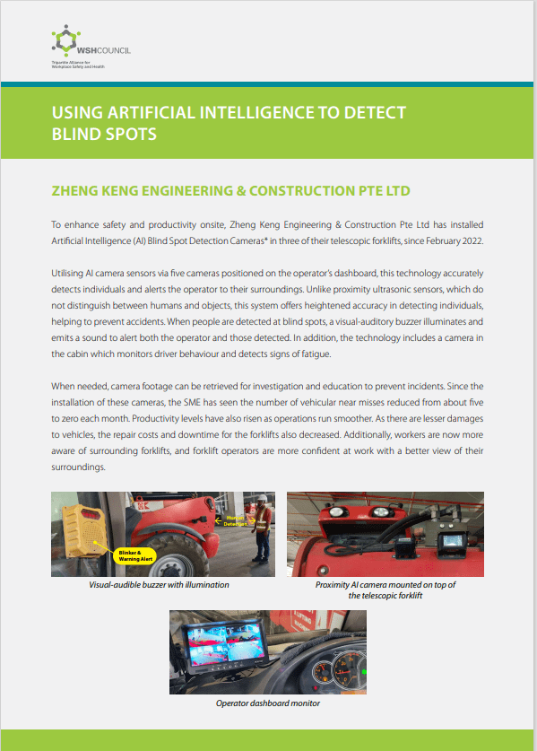 To enhance safety and productivity onsite, Zheng Keng Engineering & Construction Pte Ltd has installed Artificial Intelligence (AI) Blind Spot Detection Cameras in three of their telescopic forklifts, since February 2022.