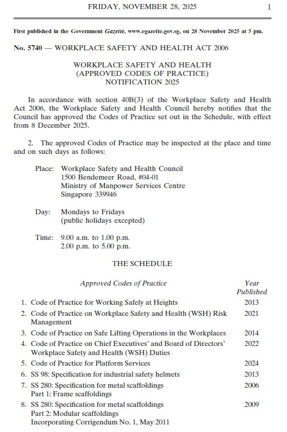 Workplace Safety and Health (Approved Codes of Practice) Notification 2025