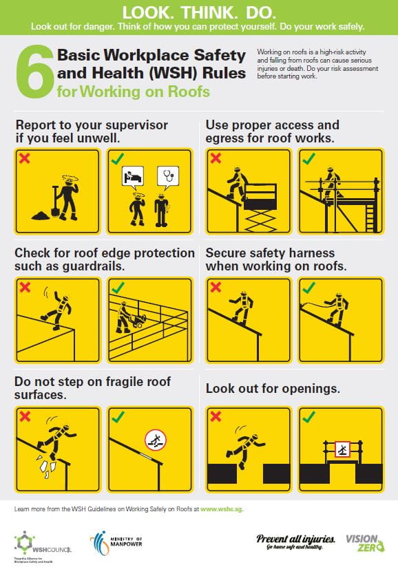 With falls from height contributing to more than a third of total workplace fatalities in Singapore every year, SMEs can build greater awareness and better manage work-at-height risks by referring to SME WSH Pack on Roofworks Safety. The Pack comprises of checklists and posters, and is available in English, Mandarin, Malay and Tamil.