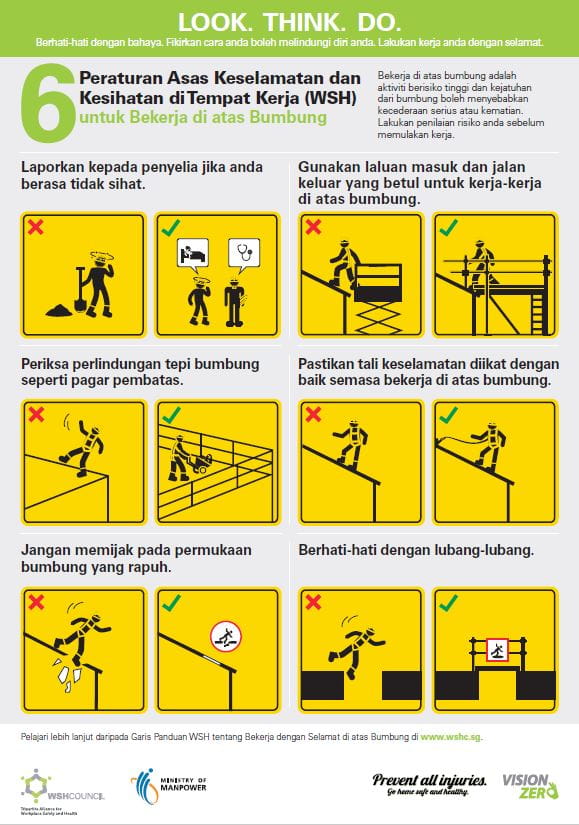 With falls from height contributing to more than a third of total workplace fatalities in Singapore every year, SMEs can build greater awareness and better manage work-at-height risks by referring to SME WSH Pack on Roofworks Safety. The Pack comprises of checklists and posters, and is available in English, Mandarin, Malay and Tamil.