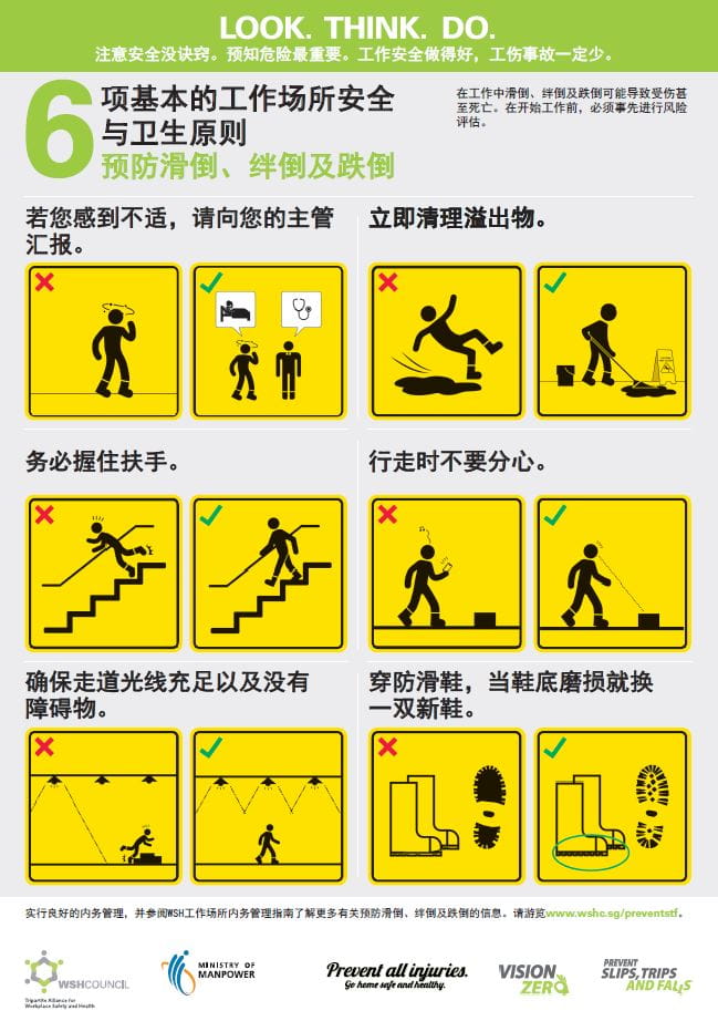 With Slips, Trips and Falls (STFs) consistently being the top cause for major and minor injuries, SMEs can refer to the SME WSH Pack on STFs to help reduce such risks at their workplace. The Pack comprises a checklist, signages and posters, and is available in English, Mandarin, Malay and Tamil.
