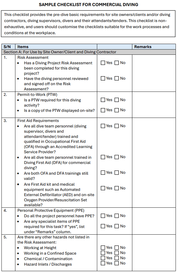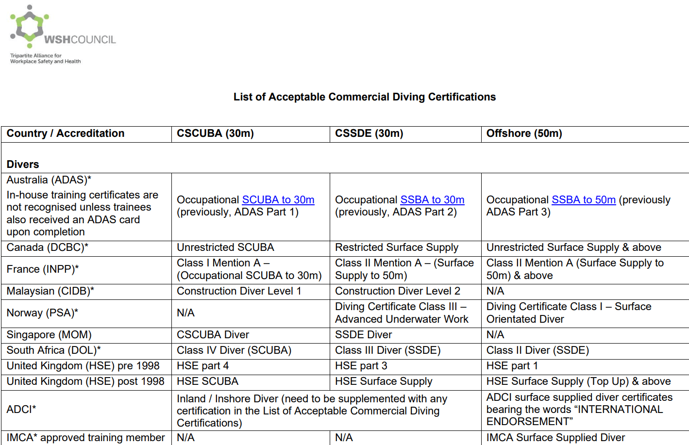 To know if the divers and/or diving supervisors possess recognised diving qualifications, check out the List of Acceptable Commercial Diving Certifications (PDF).