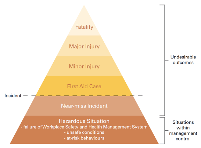 As shown in the injury pyramid below, it is possible for hazardous situations to continue to arise due to WSHMS failures (e.g. poor WSHMS implementation), unsafe workplace conditions (e.g. incomplete risk assessment) and/or at-risk behaviours.