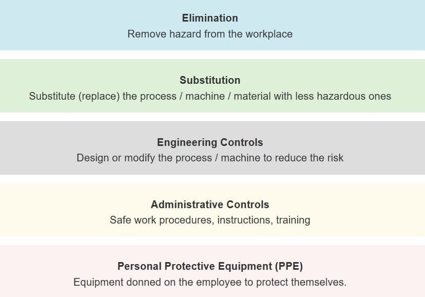 You should select your risk control measures based on the Hierarchy of Control. Upstream risk controls (e.g. elimination, substitution and engineering controls) are more effective in reducing or controlling risk, and should be considered first.